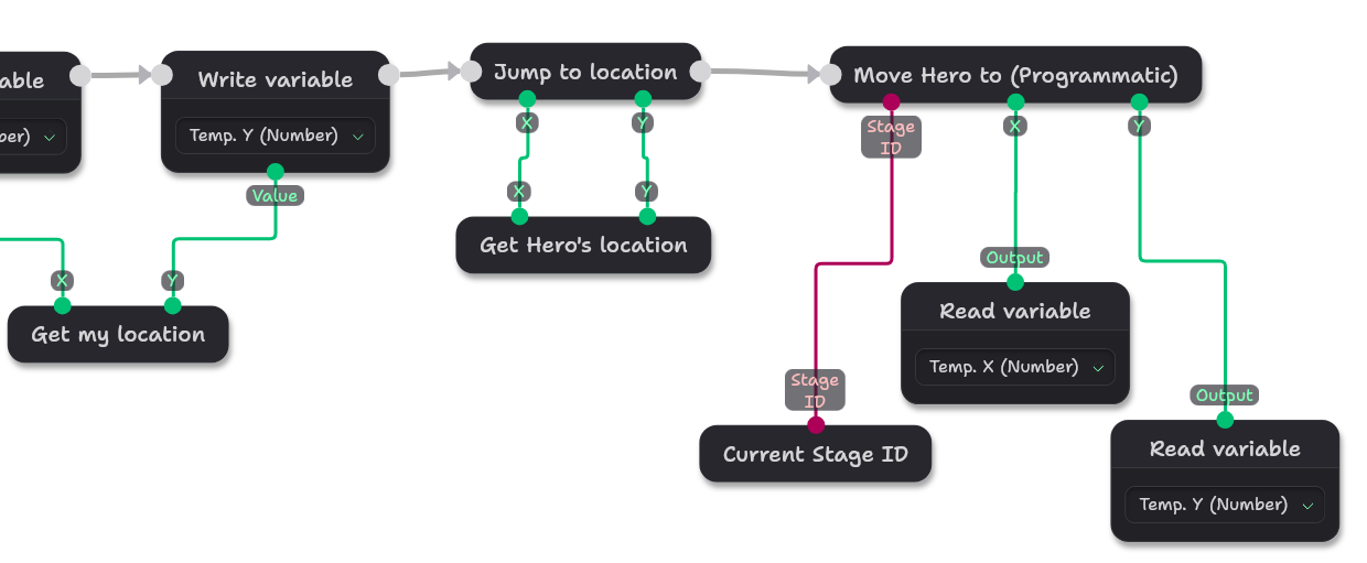 Then, after the second "Write variable", add a block called "Jump to location", and connect its X and Y inputs to another block called "Get Hero's location". This will move the Actor to Hero's location, and what's left after that is moving the Hero to old Actor's position we just remembered with variables. To do that, add a block called "Move Hero to (programmatic)". This block is usually used to move a Hero across Stages with specific coordinates you compute in some way, and it can also be used to move the Hero inside the current Stage. It's similar to exits!