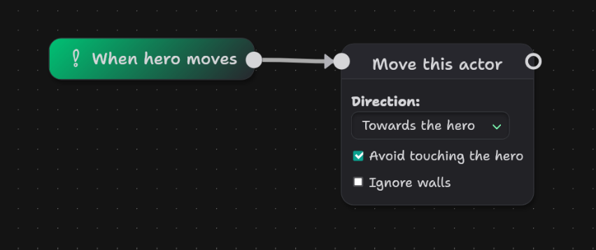Then open the Scenario tab at the top, and add an event "When hero moves". Attach a block "Move this actor", and set its direction to "Towards the hero". Also make sure that the checkbox "Avoid touching the hero" is ticked.