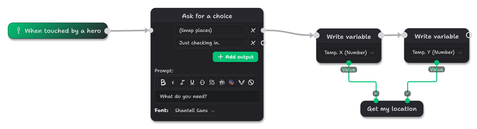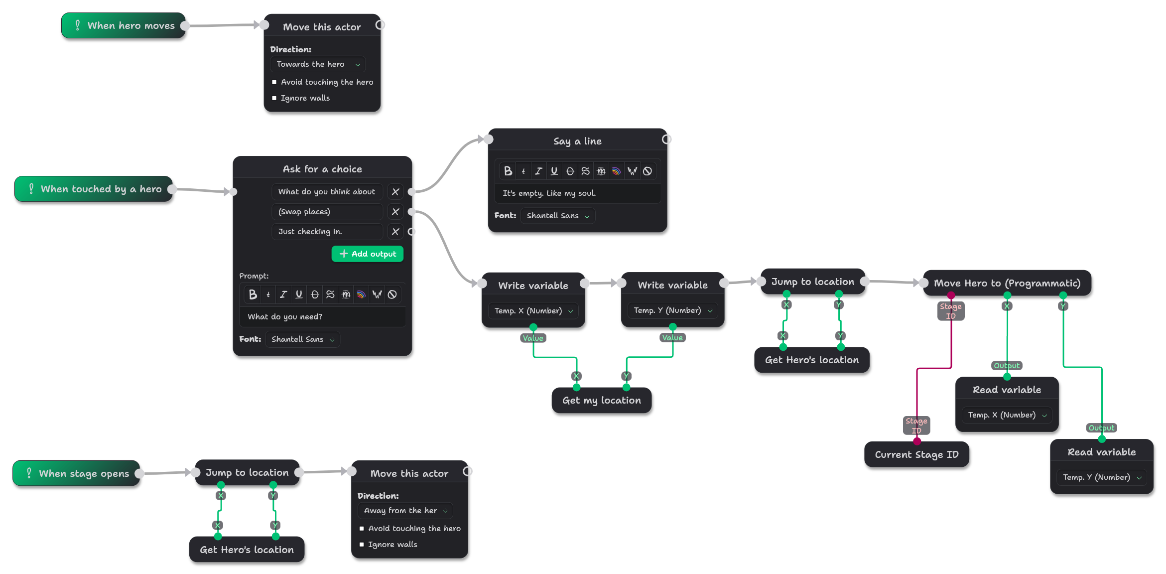 Add a new event called "When touched by a hero", and connect an "Ask for a choice" block to it. This block will show dialogue options with a prompt above them, and that's where we will place an option to swap places with the character, and where we can later add various story-related choices. Add several "outputs" to this blocks, and name one as "Swap places", and also add another one to do nothing. ("Just checking in" option in the demo above.) The latter option will have no blocks connected to it, while the "Swap places" option will have few blocks to manipulate Actor's and Hero's positions.