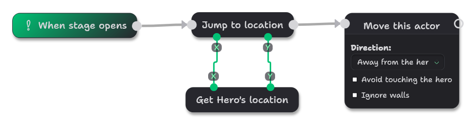 We can use the same block "Get Hero's location" to teleport to their tile when a Stage starts for that! And to move the Actor away from the Hero (so it doesn't stay on top of the Hero's tile), add a "Move this Actor" command, and set its direction to "Away from the hero with evasion".